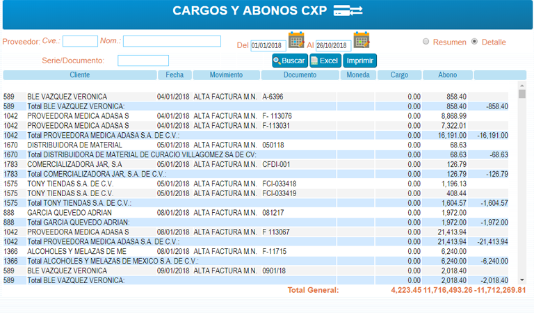 Listado de todos los Cargos y Abonos registrados en la Cuenta por Pagar.